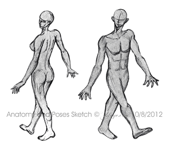 This sketch is a practice for anatomy, pose and to differentiate between the male and female anatomy. The poses for both male and female are the same except that they are from different perspectives: back and front. Females are curvier in general while males consist of more straight and lean lines.